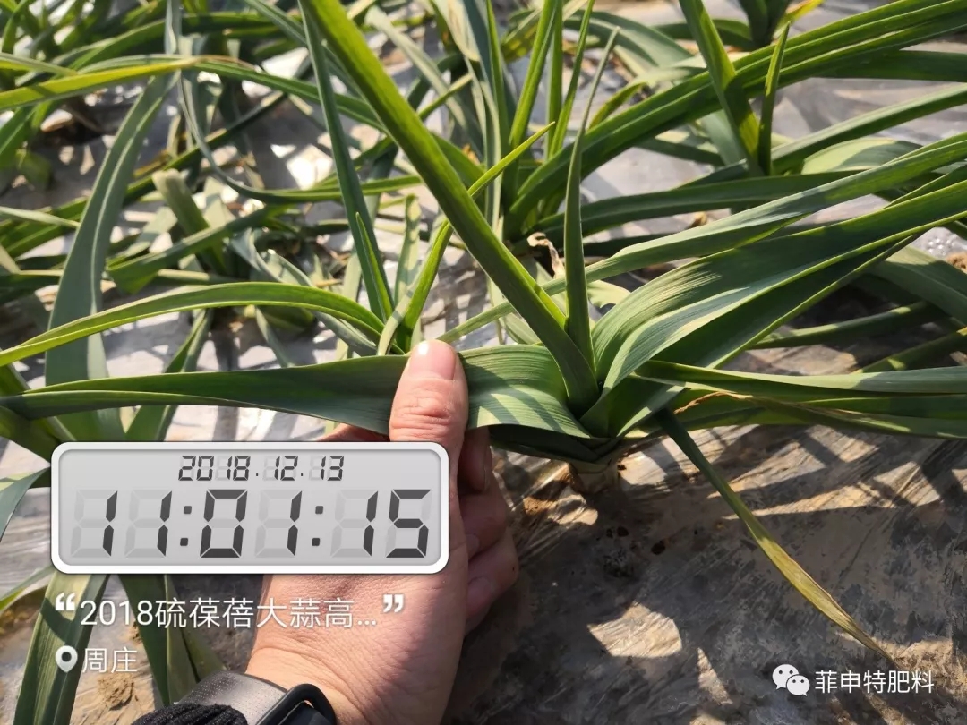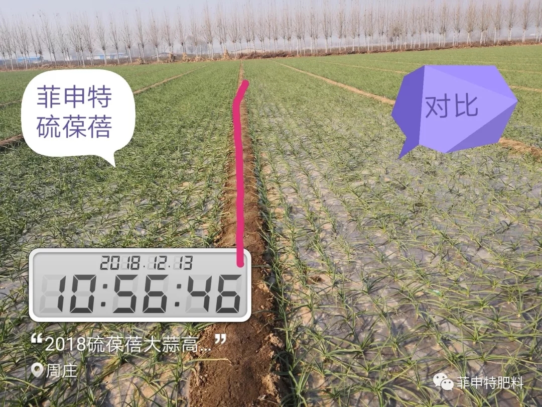 2018年(niánγ♣)12月(yuè)13日(rì),大(dà)蒜即将進入越冬期♦σ∞↓,菲申特工(gōng)作(zuò)人(rén)員(yuán)在蒜區(qū)大λ<±(dà)面積回訪硫葆蓓田間(jiān)使用(yòng)情況,詳細記錄相(xiàng)關資料數(s±✘ε∞hù)據,近(jìn)處細心觀察施用(yòng)菲申特♥'硫葆蓓高(gāo)端控釋肥的(de)蒜苗粗壯、顔色油綠(lǜ)、葉片寬厚。